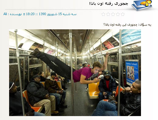 سلام من یکی از نویسنده های وبلاگ کمی تا قسمتی طنزم میخواستم اینو بگم که این پست از اونجا کپی شده و ادرسشم مال یکی دیگس بعدشم این پست(سوال احمقانه ی مایکروسافت)رو هم از اون برداشتی چون رو اون عکس کلید کنی میره تو اون که ادرسش عوض شده و پست های(عکس شباهت خداداد عزیزی با جکی چان)و(چجوری این رفته اون بالا؟)و(آگهی ها و دیوار نوشته های بامزه و خنده دار در ایران !)یعدشم حتی عنوان هارو هم عوض نکردی اخه؟؟؟